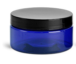 8 oz PET Heavy Wall Plastic Jar, straight side, Available in Blue & Amber, Including Black F-217 Foam Lined Caps.